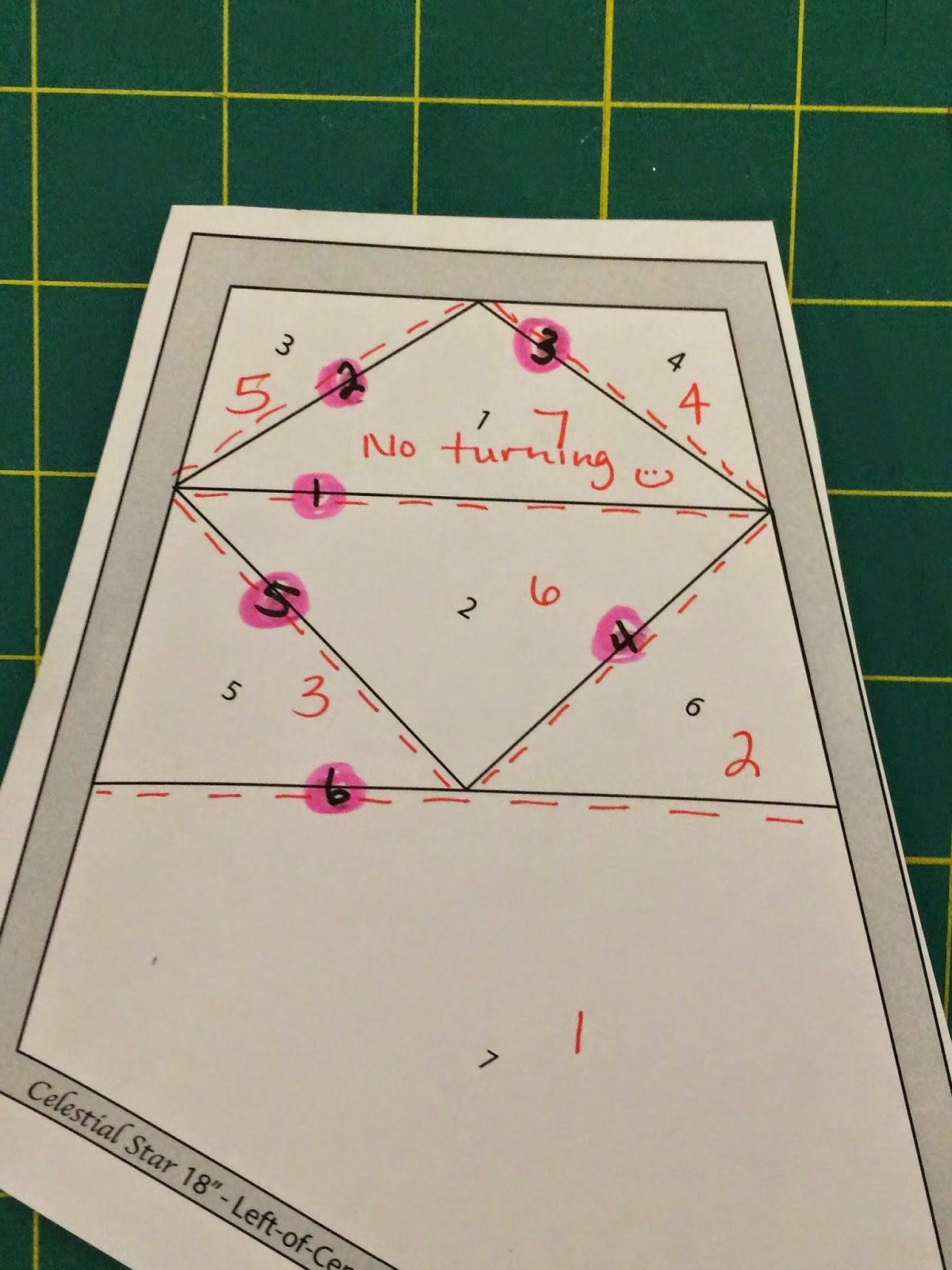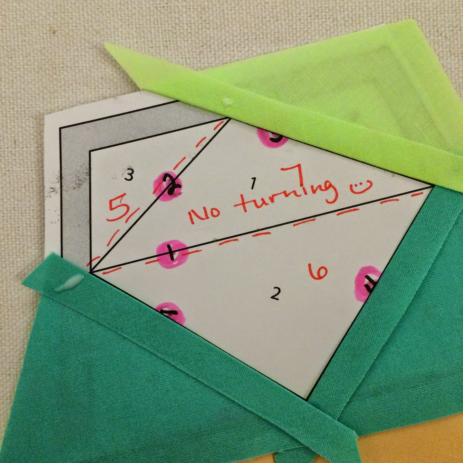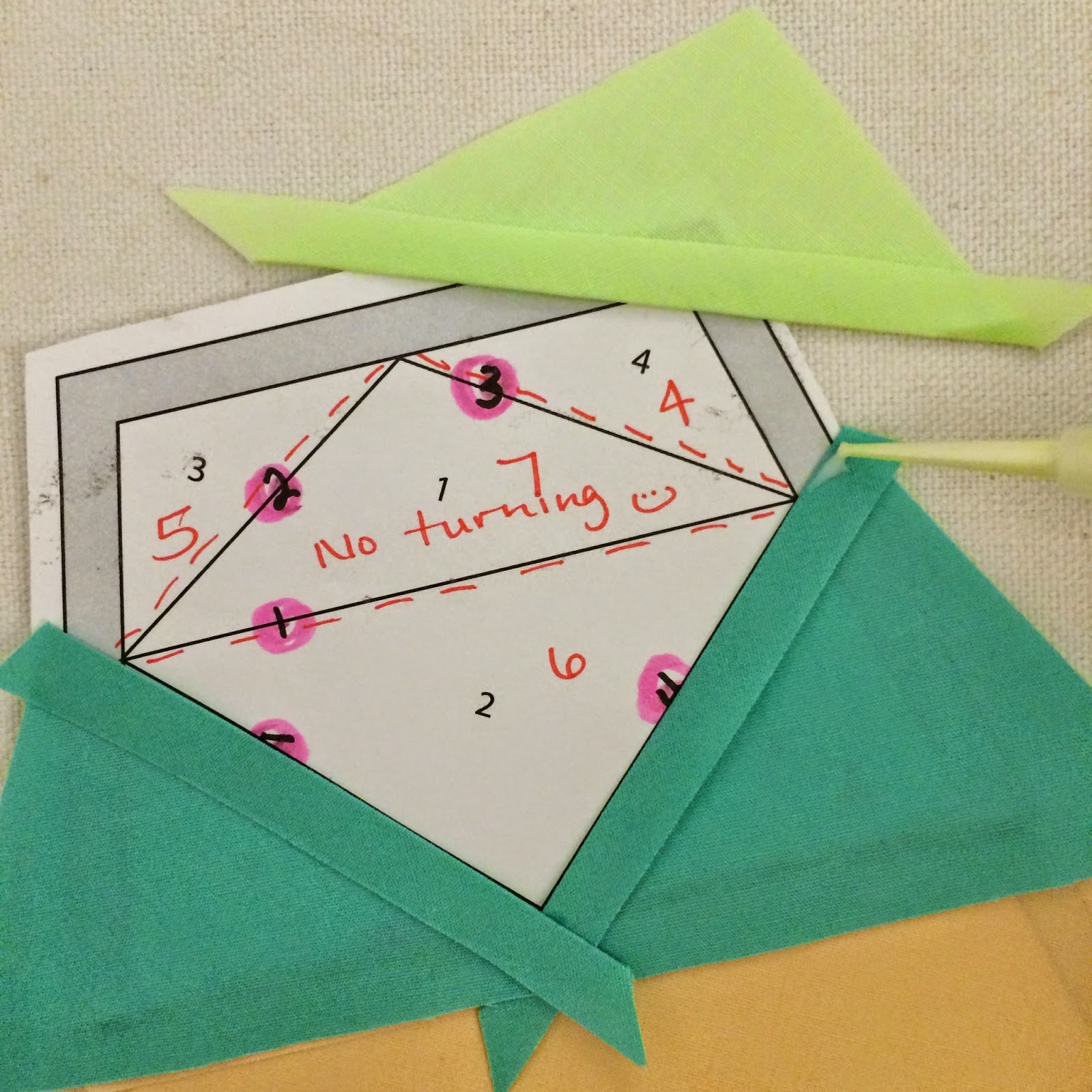 First, we decide on our layering order. Generally, the PPP layering order for the fabrics is done in the opposite order of paper piecing. This is because we will be layering and assembling our units with the wrong side up. Essentially we are making the mirror image. You can see the edits I made to the Inner template in red, in the picture below. An essential component to PPP is turning the edges of our fabrics to create a seam line. If I've already lost you, please refer back to my previous post on PPP.
