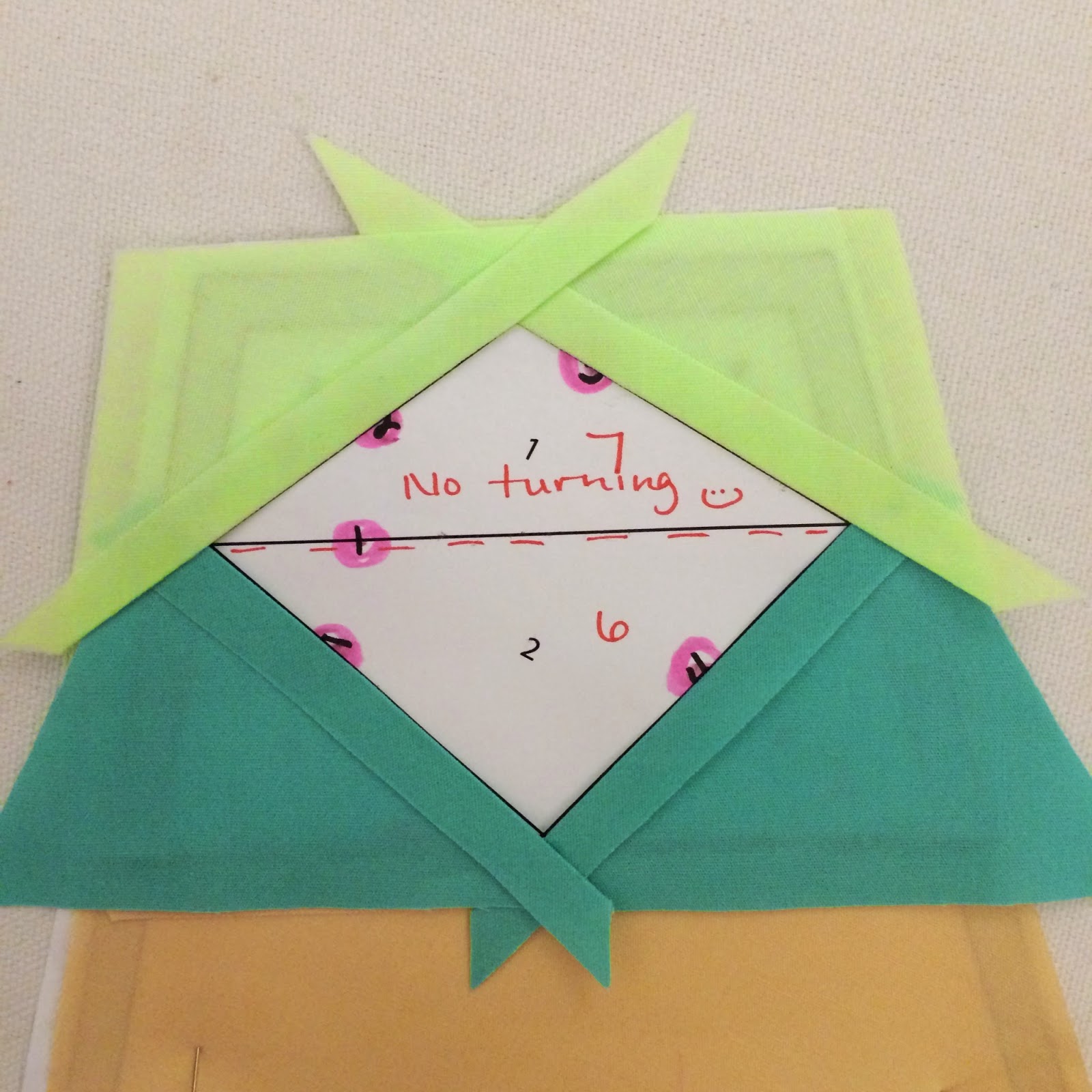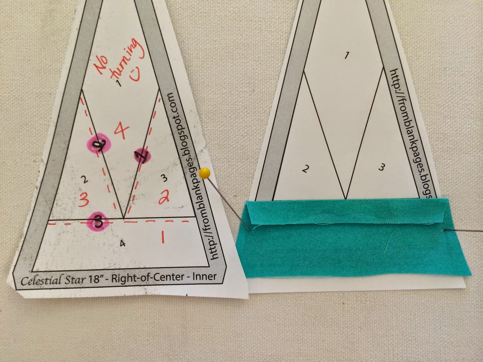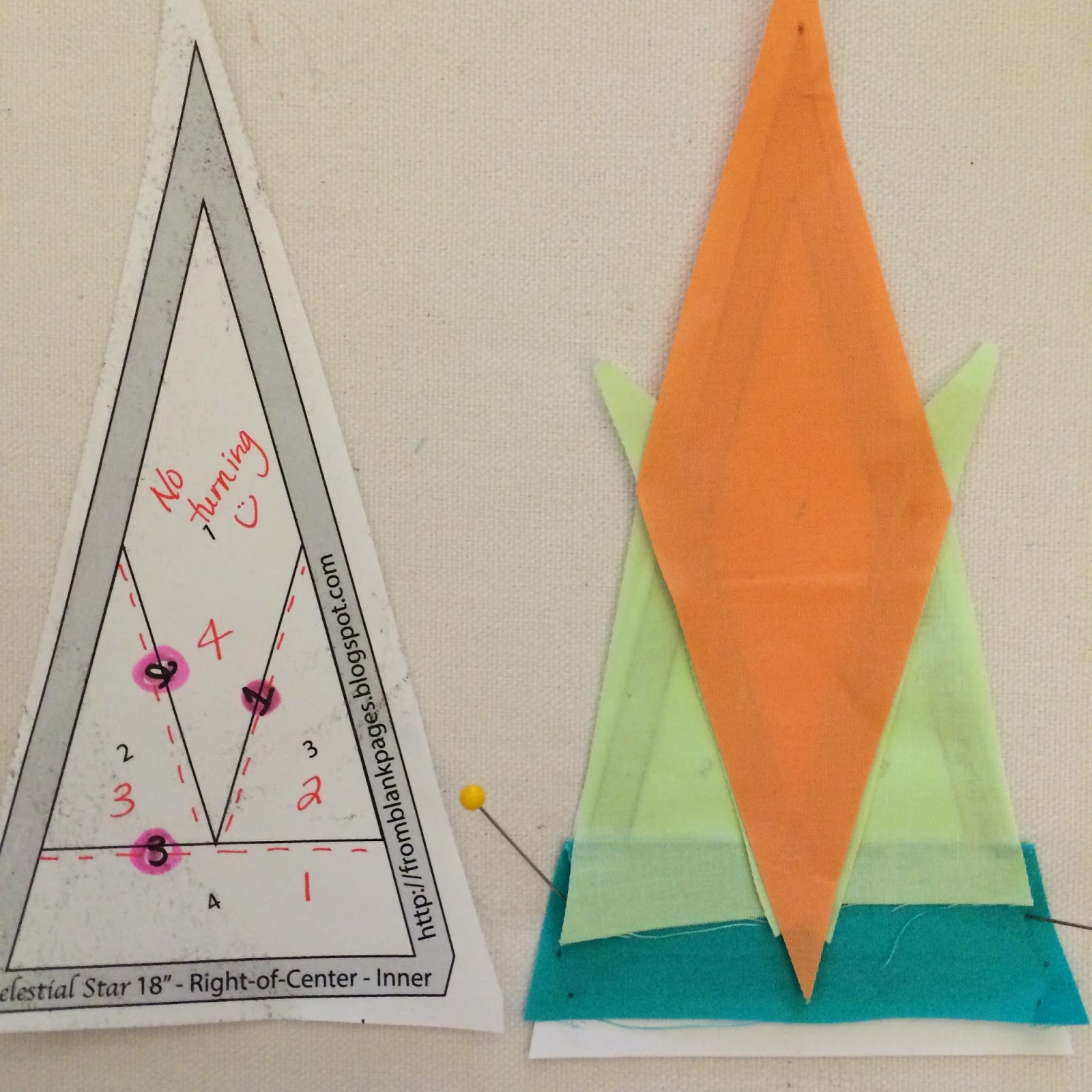 First, we decide on our layering order. Generally, the PPP layering order for the fabrics is done in the opposite order of paper piecing. This is because we will be layering and assembling our units with the wrong side up. Essentially we are making the mirror image. You can see the edits I made to the Inner template in red, in the picture below. An essential component to PPP is turning the edges of our fabrics to create a seam line. If I've already lost you, please refer back to my previous post on PPP.