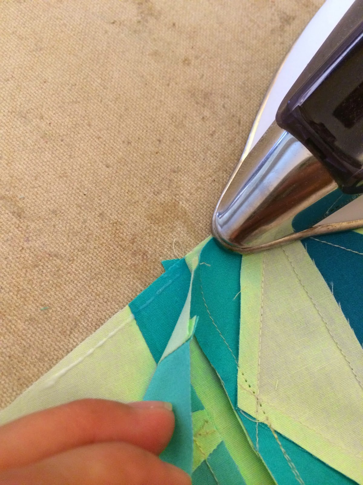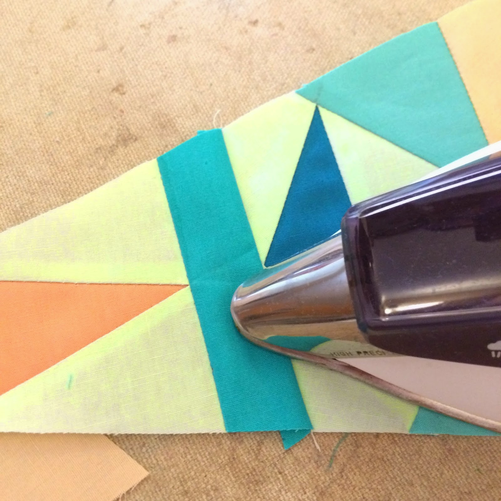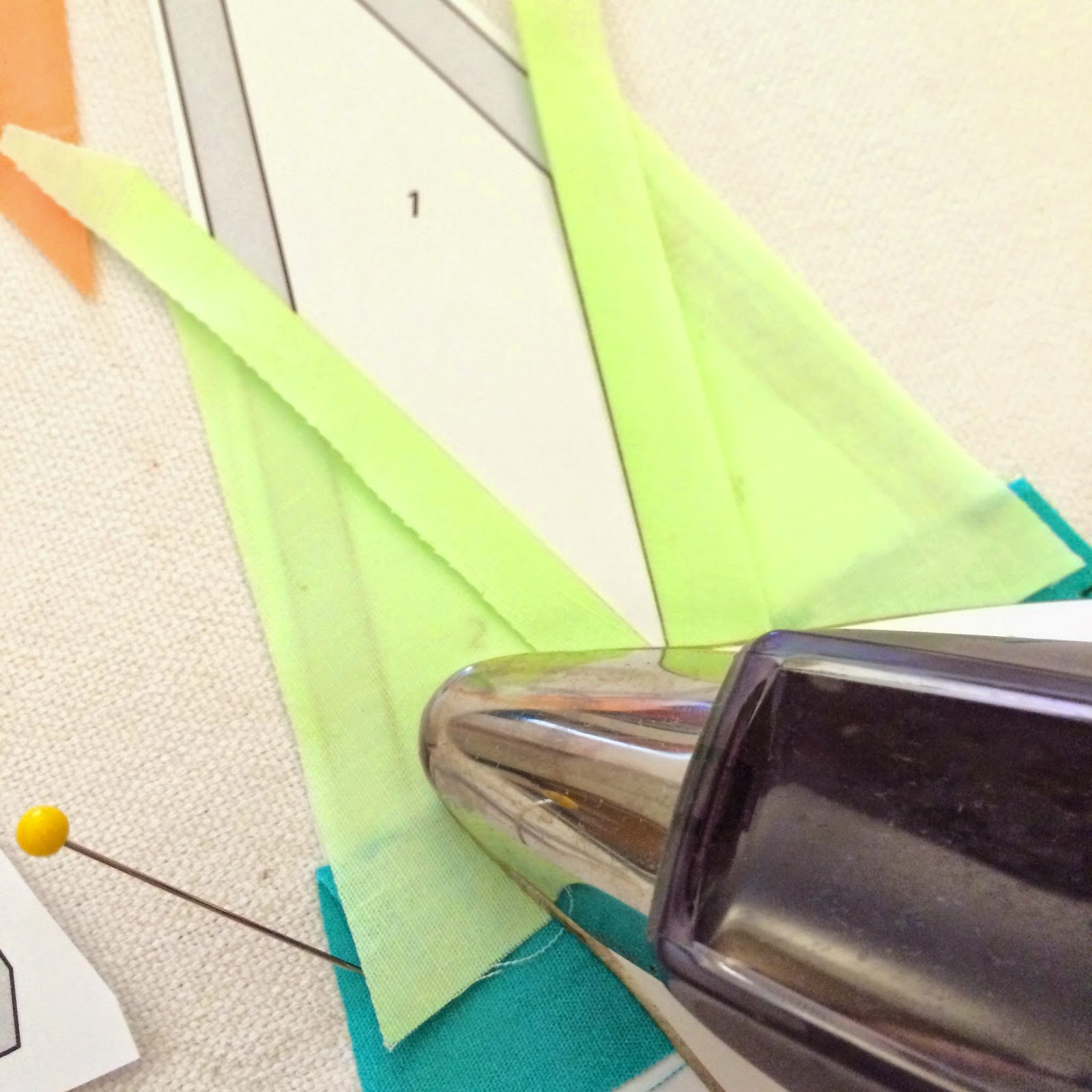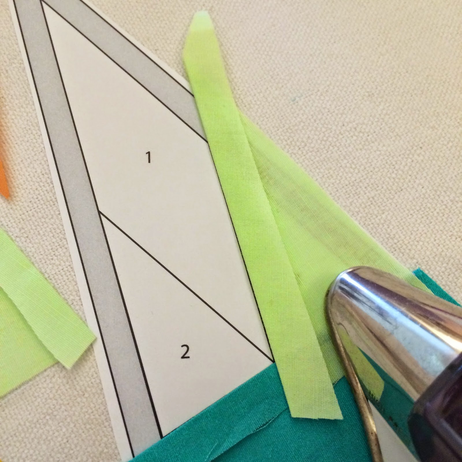 Be sure to have your design plan handy, and your fabrics ready to go. Prior to cutting my fabric with my templates, I prefer to iron them with a light spraying of starch. I love how well starched fabric pieces together. (I'm not going to walk you through cutting the fabrics, because Diane's post covers it perfectly. Just make sure to cut the fabrics with the wrong side up.)
