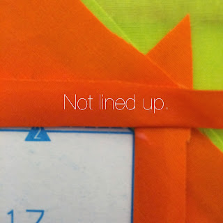 When placing your pieces, you can ensure accuracy by double checking that the edge of turned seam is letting that blue line peek out. If it's up too high, your point will be cut off. Down loo low, and your point will be, well, down too low.