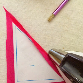 While the freezer paper template is still warm, remove it from the fabric. Repeat for each triangle.