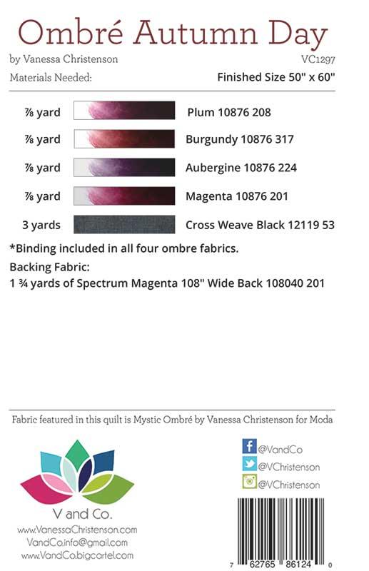 This pattern uses V and Co Mystic Ombre fabric for Moda. It features step-by-step instructions with color illustrations, pictures and diagrams.